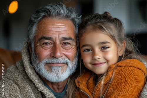 Grandfather and granddaughter share a cozy, warm moment, smiling warmly
