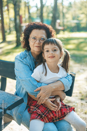 Grandmother holding her granddaughter on her lap while sitting on a park bench, showcasing love, warmth, and intergenerational bonding