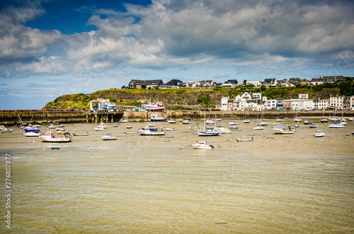 Granville, France - June 29, 2012. City view of port with colored boats at low tide