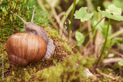 Grape snail on a stone, on a blurred background.
