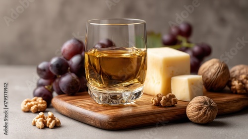Grappa and Cheese Still Life Glows With Golden Hour Warmth, Showcasing Walnuts, Grapes, and a Wooden Board