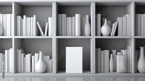 bookcase, book, vase, grey, white, shelf, poster, empty, modern, interior, design, display, studio, three-dimensional, render, furniture, minimalist, decor, object, art, neutral, simple, clean, organised, elegant, subtile, light, shadow, still, life, product, presentation, blank, bookshelf, empty space, vertical, horizontal, background, room, wall