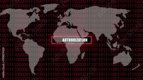 Gray map with digital binary code Generate title without using the word "Title:" before it. background and red authentication notification box over Africa globe