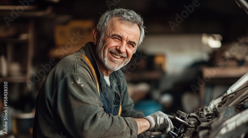 Gray-haired man in an old garage, smiling as he repairs a car, a peaceful moment of solitude and satisfaction.