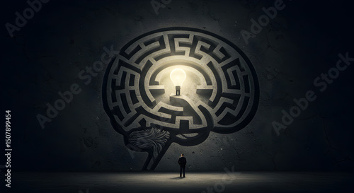 brain, labyrinth, light bulb, idea, solution, problem solving, intelligence, concept, mind, abstract, thinking, puzzle, strategy, innovation, cognition, creativity, challenge, decision, path, direction, inspiration, wisdom, education, learning, exploration, discovery, human, person, symbol, metaphor, greyscale, texture, art, design, background, dark, light, illustration, representation, clever, ingenious, bright, motivation, aim, target, way