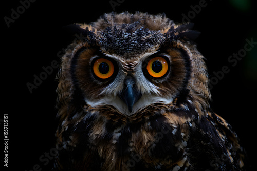Great horned owl with piercing yellow eyes in a detailed close-up portrait of a majestic bird of prey, AI generated