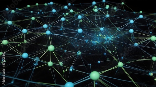 Green and blue data nodes illustration, network connection and technology concept, digital technological abstract background