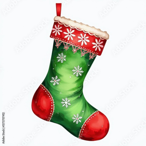 christmas, stocking, holiday, festive, green, red, white, snowflake, fur, trim, decoration, ornament, winter, celebration, season, traditional, hanging, gift, present, empty, textile, fabric, design, illustration, graphic, isolated, background, marketing, banner, website, greeting, card, december, merry, event, party