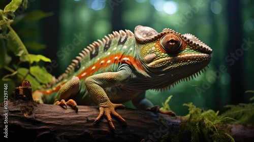 chameleon, green, reptile, lizzard, forest, tree branch, tropical, wildlife, nature, animal, orange, black, scale, eye, camouflage, jungle, rainforest, fauna, closeup, macro, detail, background, blurry, leaf, green leaf, foliage, bright, colourful, high-coloured, texture, pattern, spotted, wood, bark, moss, habitat, environment, photo