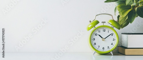 clock, green, alarm, time, book, study, office, desk, table, plant, leaf, white, background, minimalist, simple, modern, design, education, learning, reading, cognition, wisdom, organisation, schedule, planning, productivity, efficiency, sharpened, concentration, calmness, peace, calm, serenity, quiet, stillness, home, decor, style, interior, aesthetic, life, work