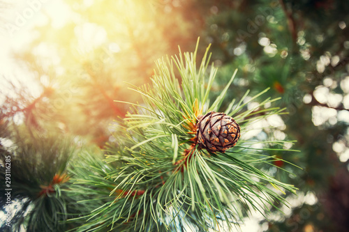 Green coniferous cedar ripe pine cones on tree branch forest sunlight. Concept harvesting and receiving oil