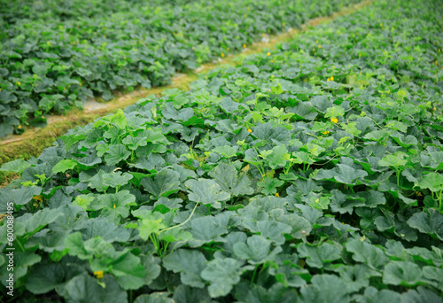 Green cucumber crops in growth in garden, China