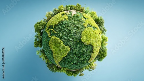 earth, globe, green, lush, vegetation, nature, planet, earth, environment, eco, sustainable, tree, plant, foliage, grass, ecosystem, flora, high-coloured, vividly, life, organic, three-dimensional, model, rendering, realistic, isolated, light, blue, background, top, view, ball-shaped, round, detailed, contour, map, geography, climate, protected, safe, healthy, biodiversity, conscious, harmony, balance, preservation, sustain, future