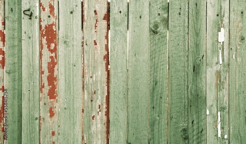 Green Faded Wooden Fence. Old Weathered Wood Planks. Rustic Aged Surface
