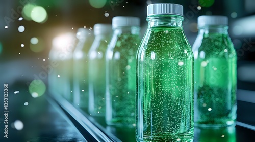 Green glass bottles filled with sparkling liquid on production line with bokeh light effects and selective focus creating modern industrial atmosphere.