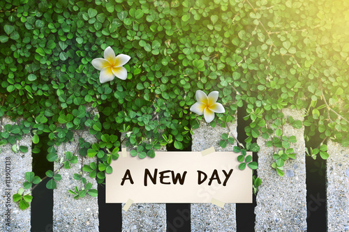 Green Grass, Flower with Morning Light and New Day Word on Paper