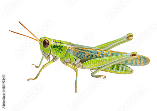 Green grasshopper with intricate wing patterns and segmented body isolated on a transparent background