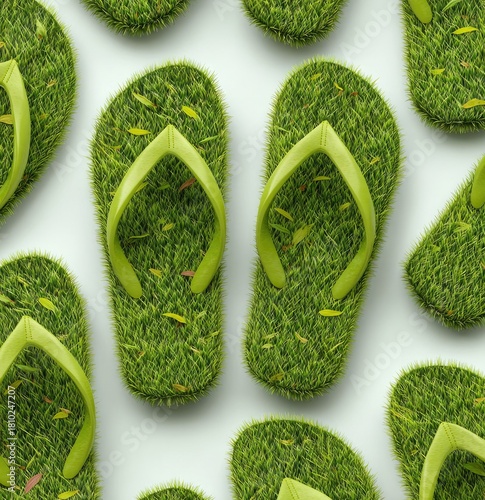 flip-flop, sandal, grass, green, eco, footwear, shoe, summer, nature, environment, natural, organic, texture, pattern, barefoot beach, vacation, holiday, relaxation, comfort, casual attire, style, design, unique, creative, whimsical, unusual, artistic, artificial, botanical, plant, growth, fresh, vibrant, lively, springtime, outdoors, healthy, well-being, renewable, sustainable, ecological, environmentalism, conceptual, rendering, illustration, object, nobody, still life
