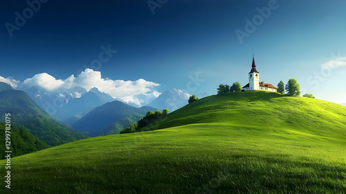 landscape, hill, mountain, sky, green, blue, nature, church, building, cloud, scenic, daylight, outdoors, environment, field, vale, vegetation, rural, pasture, summer, spring, panorama, horizon, calmness, serene, calm, beautiful, picturesque, elevation, slope, meadow, grass, lush, bright, fresh, vibrant, aethereal, majestic, peaceful, tour tourism, travel, destination, distant, clarity, wide, view, up high