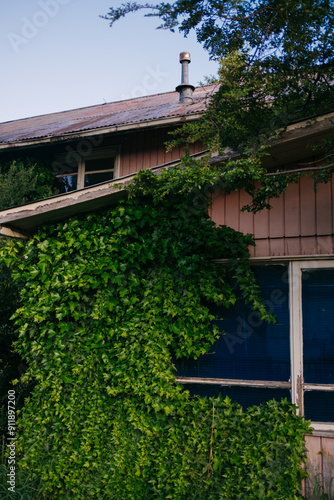 Green ivy growing on old house