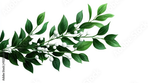 Green leafy branch with white berries, white isolate background.
