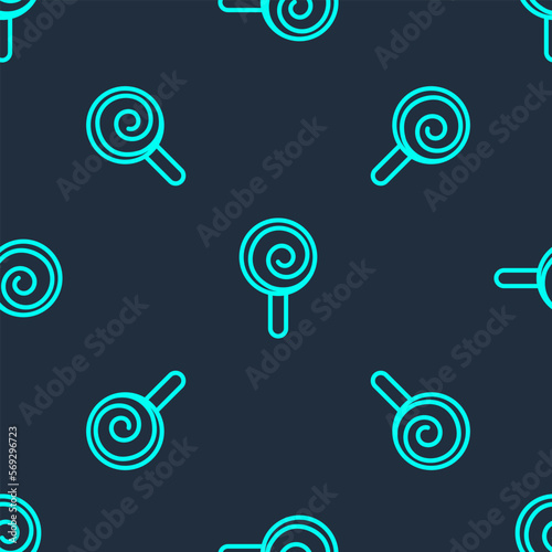 Green line Lollipop icon isolated seamless pattern on blue background. Candy sign. Food, delicious symbol. Vector