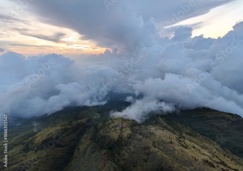 mountain, landscape, cloud, sky, aerial view, scenic, nature, green, terrain, hill, daylight, travel, environment, adventure, altitude, elevation, wilderness, cloudscape, mist, rural, overcast, panoramic, view, summit, mountain chain, natural, cloudy, peak