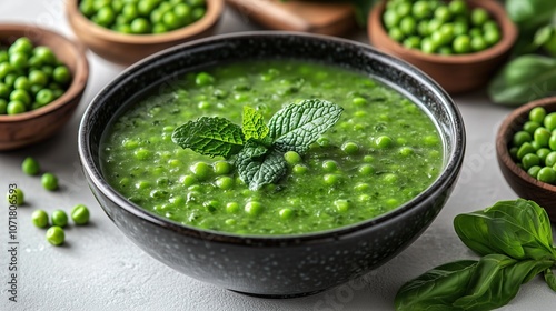 Green pea soup in a bowl with mint garnish