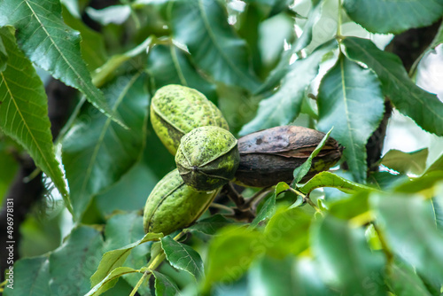 Green pecan nuts growing on tree in Brazil