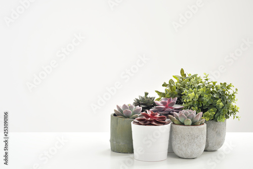 Green plants, succulents, in cement concrete pots stand in a row on a white background. The concept of a flower shop, gifts for women and the protection of nature.