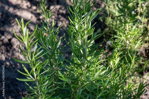 Green rosemary leaves in agriculture plantation. Fresh herb