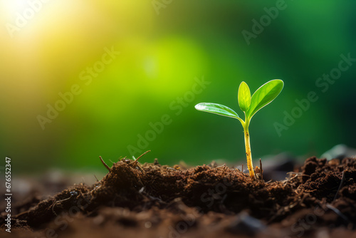 Green sprout in the ground, with green blurred bokeh background, with space for text