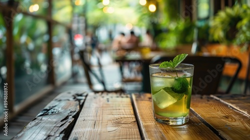 Green tea on wooden table in coffee shop with copy space