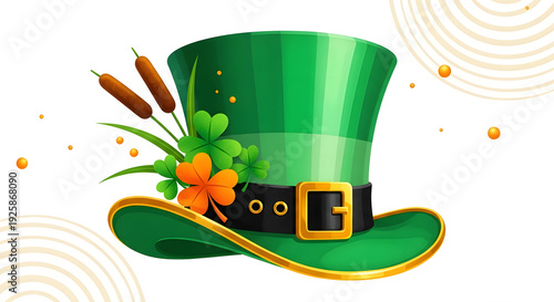 silk hat, shamrock, celebration, festive, hat, accessory, costume, luck, traditional, symbol, icon, graphic, illustration, digital artwork, colourful, vibrant, whimsical, playful, fun, seasonal, march, green, gold, black, orange, flower, leaf, stem, merry, jolly, top, trim, floral, decoration