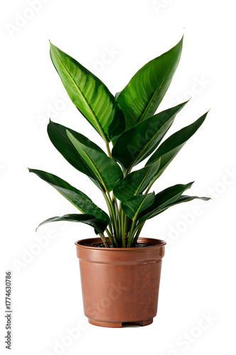 Green tropical houseplant in brown plastic pot isolated on white background — modern home decor and indoor greenery