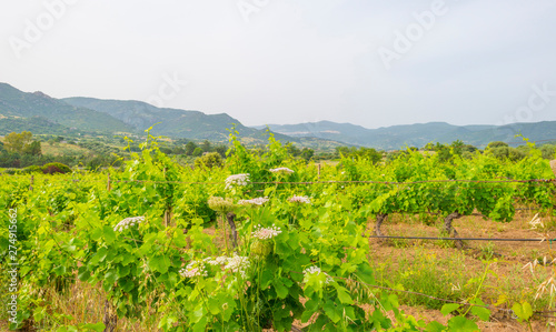 Green vineyards in the hills of the island of Sardinia in sunlight in spring