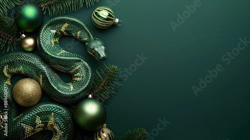 Green wooden snake with Christmas decorations and holiday decor. Symbol of Chinese New Year 2025.