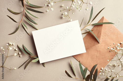 Greeting or invitation card mockup with envelope, eucalyptus and gypsophila twigs. Card mockup with copy space on beige background.
