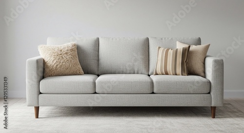 Grey sofa with stylish cushions in modern living room interior