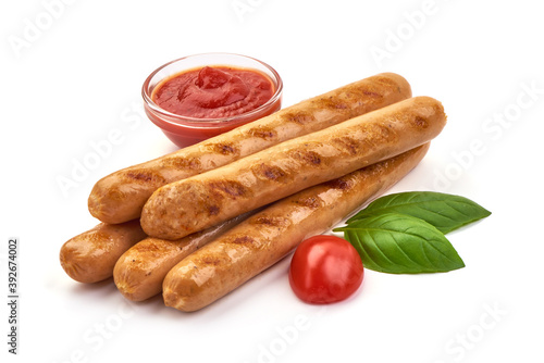 Grilled chicken hot dog sausages, close-up, isolated on white background