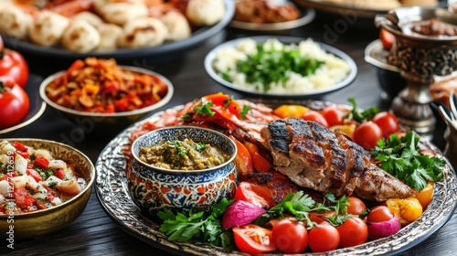 grilled fish, fresh vegetable, herb, spice, gourmet food, healthy eating, healthy lifestyle, food photography, close-up view, home cooking, feast, juicy fruit, culinary arts, picnic table