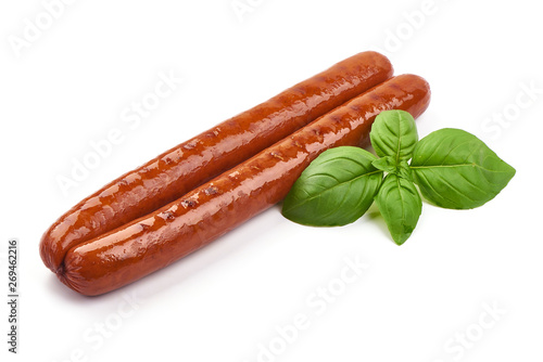 Grilled Pork Sausages with basil leaves, close-up, isolated on white background