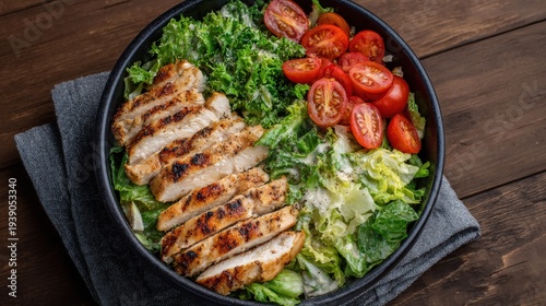 halved, healthy, homemade, meal, organic, seasoning, overhead, sliced, savoury, bowl, dark, tomatoes, ingredient, greener, background, poultry, wooden, warm, crisp, cherry, vibrant, surface, protein, cooked, lunch, delicious, portion, rustic, epicure, closeup, plate, dressing, nourishment, chicken, white, dinner, appealing, food, diet, preparation, grilled, lettuce, table, cookery, fresh, meat, salad