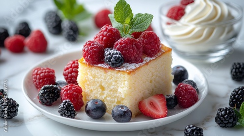 pound cake, raspberry, blackberry, blueberry, white plate, food photography