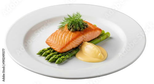 Grilled salmon fillet served on asparagus with a dollop of creamy sauce and fresh dill garnish on a white plate, perfect for healthy dinners