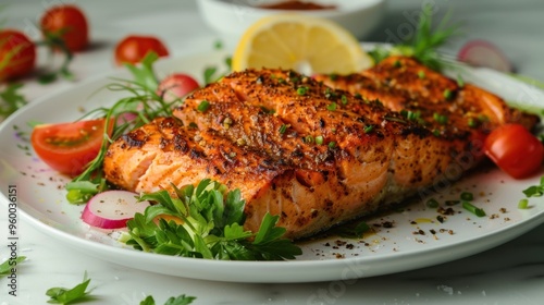 grilled, salmon, fresh, salad, plate, closeup, succulent, garnished, herb, vibrant, white, seafood, dinner, meal, healthy, cookery, dish, lunch, eating, food, tomatoes, onion, arugula, greener, pepper, eatery, favor, organic, protein, fish, culinary, epicure, weight, mealtime, nourishment, cooked, tasty