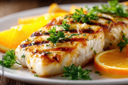 Grilled white fish fillets served with bright citrus slices and fresh green herbs