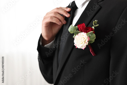 Groom in suit with stylish boutonniere indoors, closeup