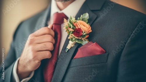 groom, suit, burgundy, red, attaching, floral, boutonniere, rose, orange, red rose, wedding, fashion, menswear, style, elegant, formal, texture, clothes, fabric, detail, closeup, photo, attire, grooming, preparation, marriage, ceremony, event, celebration, stylish, sophisticated, classic, man, gentleman, photogenic, accessory, outfit, apparel