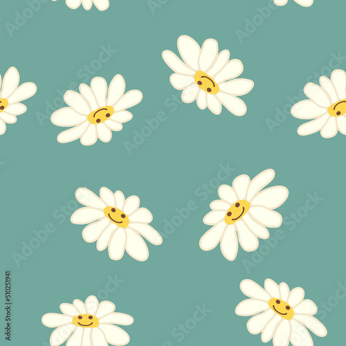 Groovy daisy retro seamless pattern. Positive colorful iilustration. 70s vibe hippie ornament.